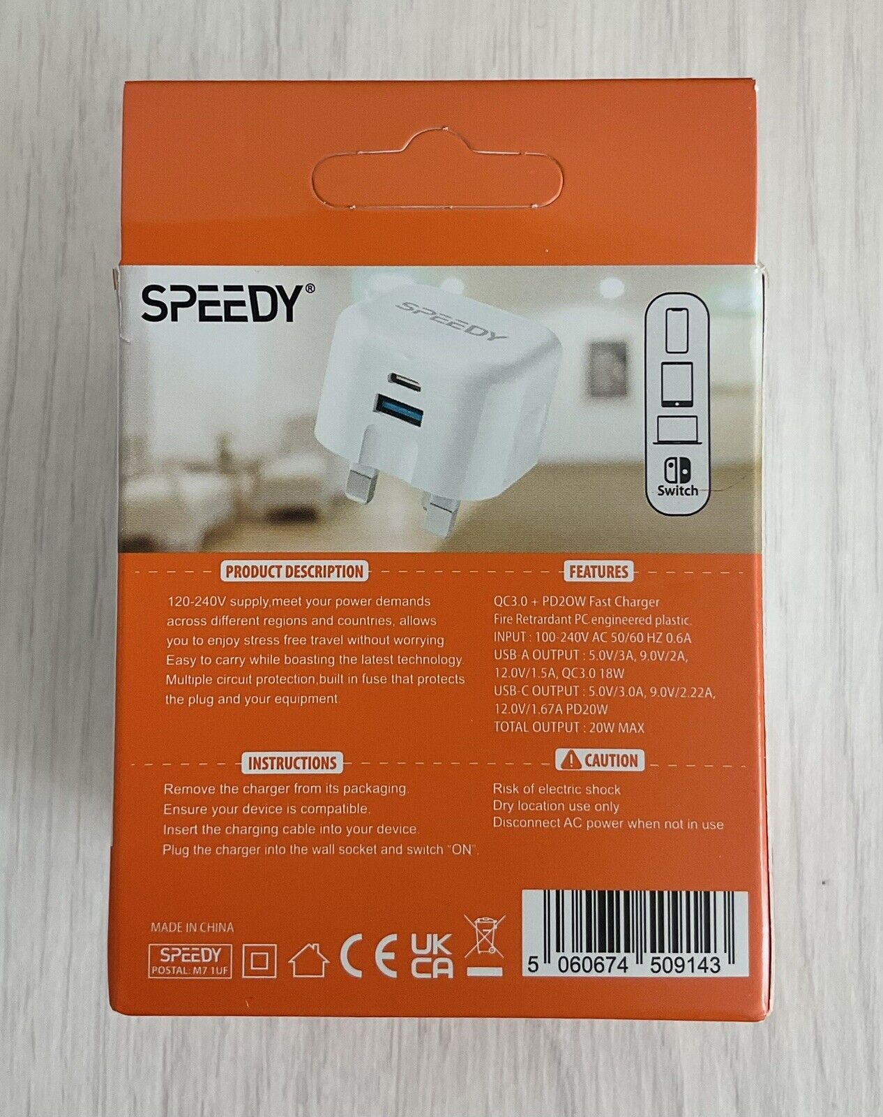 Remove the charger from its packaging. Ensure your device is compatible. Insert the charging cable into your device. Insert the cable into plug and your device. Plug the charger into the wall socket and switch "ON".