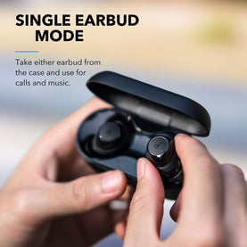 Place earbuds inside the charging case to recharge. Connect the case using a USB C cable when battery is low.