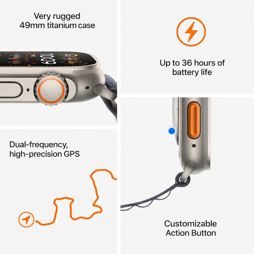The Apple Watch Ultra 2 is a rugged, high-performance smartwatch designed for athletes, adventurers, and everyday users seeking precision, durability, and connectivity. Featuring a corrosion-resistant 49 mm titanium case and an ultra-bright Always-On Retina display, it delivers all-day performance with up to 36 hours of battery life and expanded 72 hours in Low Power Mode.